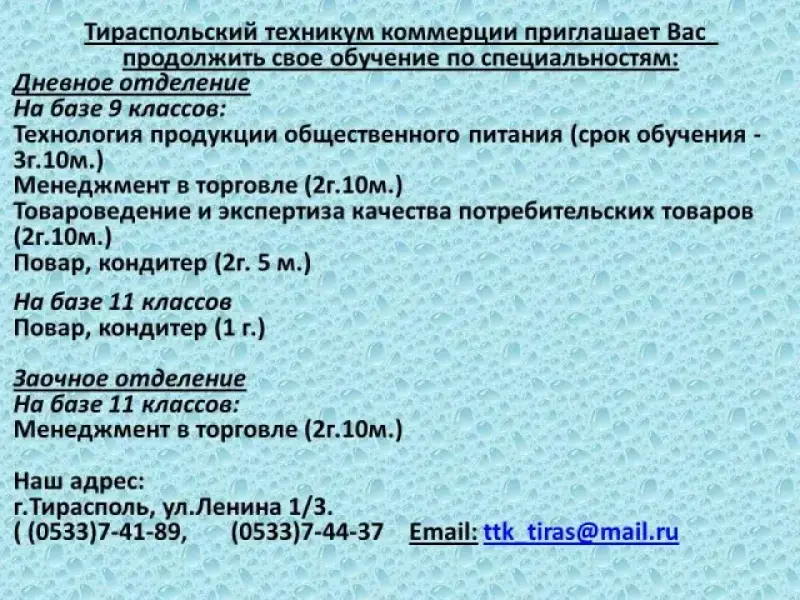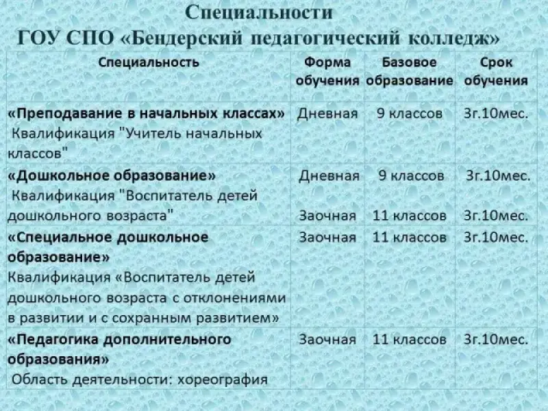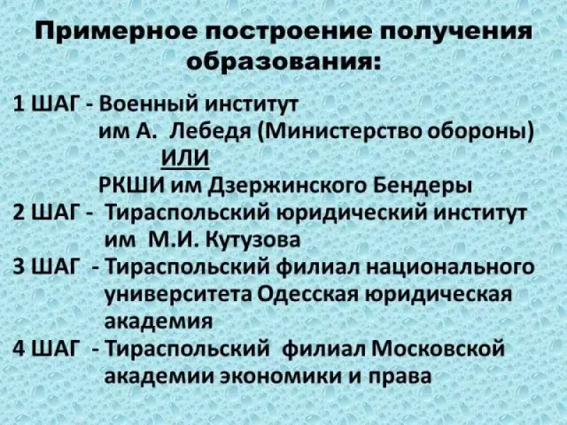 Получение образования: Бендерский педагогический колледж, ПГУ им Т.Г. Шевченко.