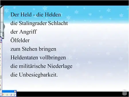 Der Held - die Heden, die Stalingrader Schlacht, der Angriff, Ölfelder, zum Stehen bringen, Heldentaten vollbringen, die militärische Niederlage, die Unbesiegbarkeit. (Учащиеся слушают и