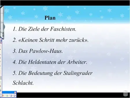 Wir erinnern uns zuerst an die Tage der Stalingrader Schlacht. Jetzt arbeitet ihr in den Gruppen an einem Text. Ihr müsst folgende Fragen beantworten und einen Plan machen. (Рис 6.)