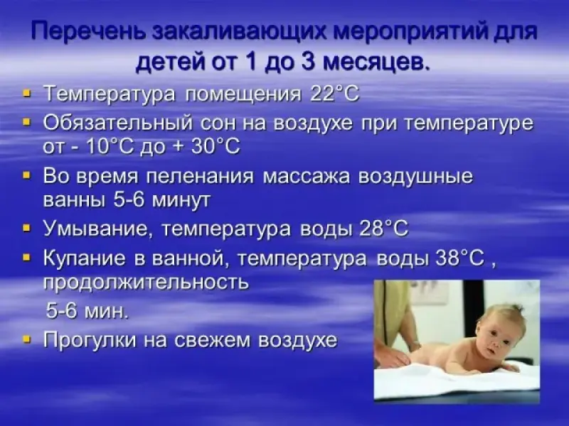 Закаливание детей предусматривает воздействий на организм ребенка физических факторов внешней среды - воздуха, воды, солнца. Дети первого года жизни наиболее подвержены холоду, в связи с чем закаливающие процедуры направлены на тренировку терморегуляции.