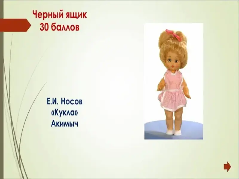 Кол-во баллов Вопрос Ответ 10 Александр Сергеевич Пушкин 20 Николай Васильевич Гоголь 30 Антон Павлович Чехов 40 Владимир Владимирович Маяковский 50 Фёдор Александрович Абрамов
