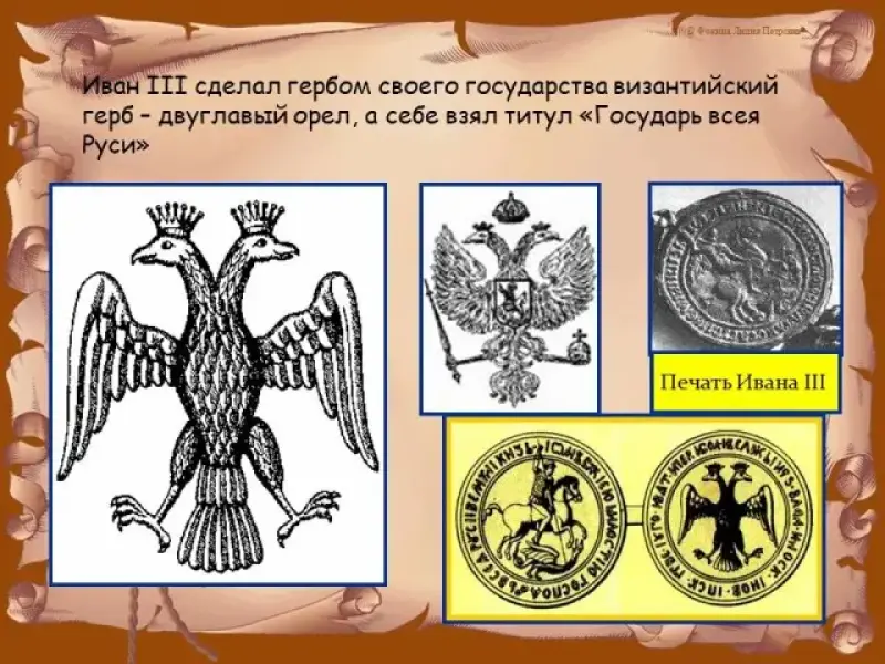 3. В период правления Ивана III небывалого подъема достигло архитектурное строительство, стремительно развивается летопись. Он заложил основы российской государственности: появляется герб, с изображенным на нем двуглавым орлом. Одним из важных моментов правления стал Судебник (1497г.) Он представлял собой свод законов единого государства, которые применялись в то время на Руси.