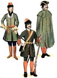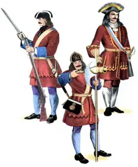 1. Офицер Преображенского полка. Зелёный кафтан длиною до колен. На ноги надеты чулки, сапоги или штиблеты. Вокруг шеи завязан чёрный галстук, на руки одеты кожаные или лосиные перчатки, на голове медвежья шапка с красным верхом. На поясе завязан шарф. По борту, краям обшлагов и карманных клапанов кафтана и камзола, по боковому шву штанов и краю шляпных полей - нашит золотой галун. Оружие- шпага.