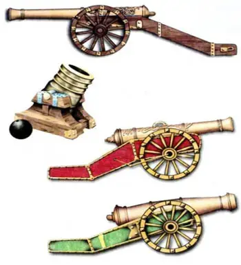 1. Пушка, 2 Мортира, 3, 4 Гаубица