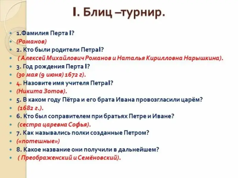 2. Кто были родители ПетраI? (Алексей Михайлович Романов и Наталья Кирилловна Нарышкина).