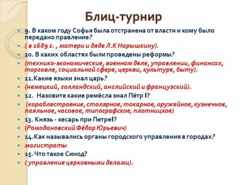 13. Князь - кесарь при Петре I? (Ромодановский Фёдор Юрьевич) 14.Как назывались органы городского управления в городах? (магистраты) 15. Что такое Синод? (управление церковными делами).
