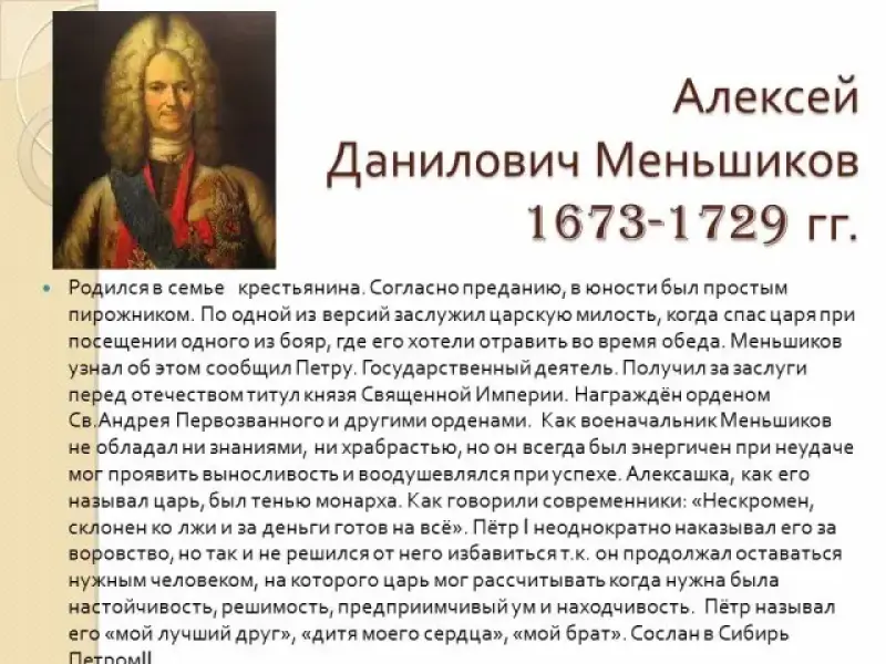 Родился в семье крестьянина в Согласно преданию, в юности был простым пирожником. По одной из версий заслужил царскую милость, когда спас царя при посещении одного из бояр, где его хотели отравить во время обеда. Меньшиков узнал об этом сообщил Петру. Государственный деятель.Получил за заслуги перед отечеством титул князя Священной Империи. Награждён орденом Св.Андрея Первозванного и другими орденами. Как военачальник Меньшиков не обладал ни знаниями, ни храбрастью, но он всегда был энергичен при неудаче мог проявить выносливость и воодушевлялся при успехе. Алексашка, как его разывал царь, был тенью монарха. Как говорили современники: "Нескромен, склонн ко лжи и за деньги готов на всё". Пётр I неоднократно наказывал его за воровство, но так и не решился от него избавиться т.к. он продолжал оставаться нужным человеком, на которого царь мог расчитывать когда нужна была настойчивость, решимость, предприимчивый ум и находчивость. Пётр называл его "мой лучший друг", "дитя моего сердца", "мой брат". Сослан в Сибирь Петром II.