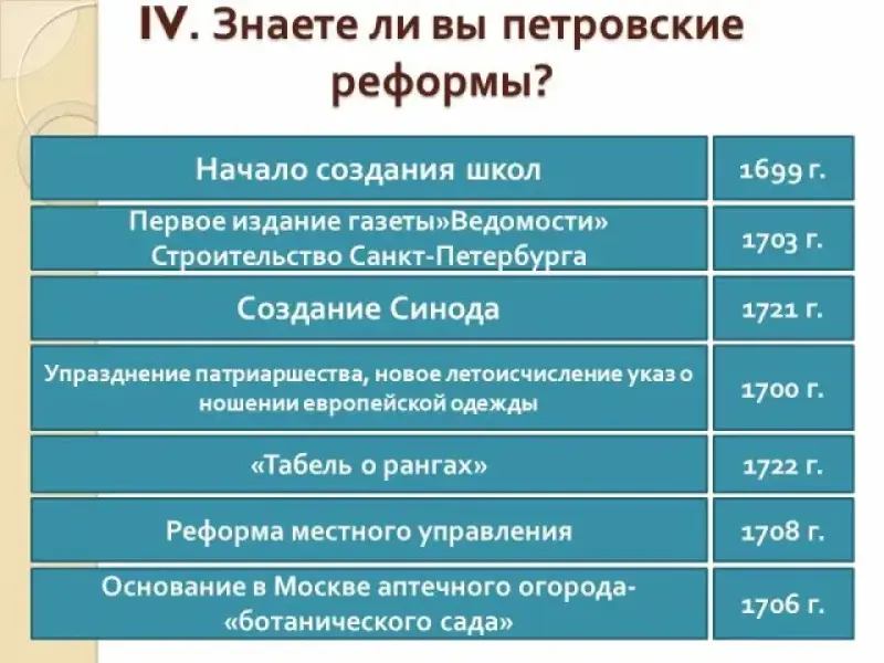 IV. Знаете ли вы реформы?Поставить события и даты в хронологической последовательности. (Вопросы ко всей команде) (Слайд14-15)