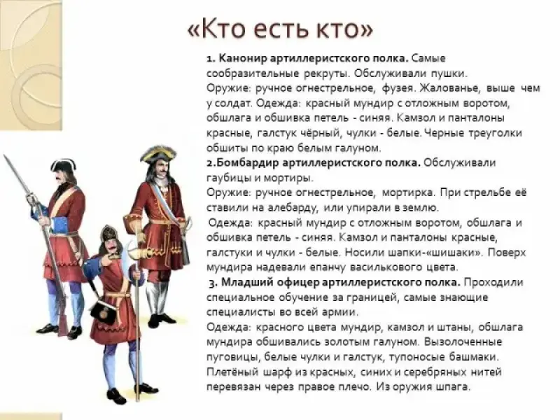 1. Канонир артиллеристского полка. Самые сообразительные рекруты. Обслуживали пушки. Оружие: ручное огнестрельное, фузея. Жалованье, выше чем у солдат. Одежда: красный мундир с отложным воротом, обшлага и обшивка петель - синяя. Камзол, панталоны красные, галстук чёрный, чулки - белые. Черные треуголки обшиты по краю белым галуном.