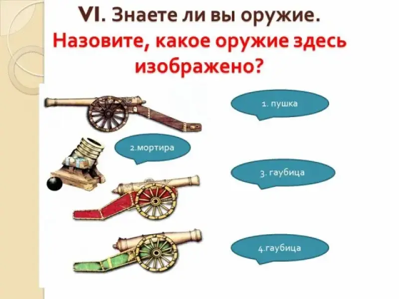 VI. Знаете ли вы оружие. Назовите, какое оружие здесь изображено. (Слайд 19)