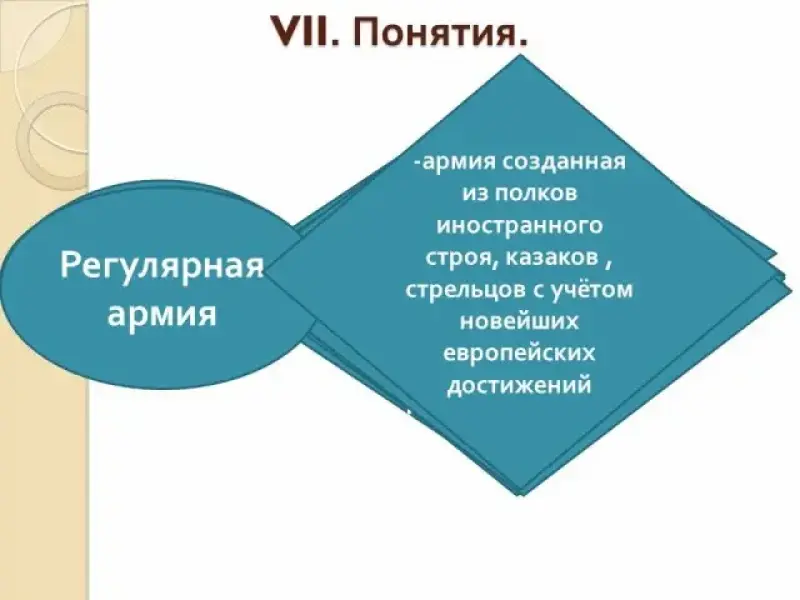Регулярная армия - армия, созданная из полков иноземного строя, стрельцов и казаков с учётом новейших европейских достижений.