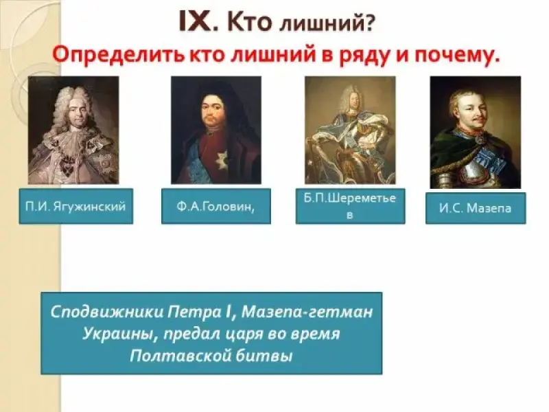 1. П.И. Ягужинский, Ф.А.Головин, Б.П.Шереметьев, И.С.Мазепа.(Сподвижники Петра I, Мазепа-гетман Украины, предал царя во время Полтавской битвы )