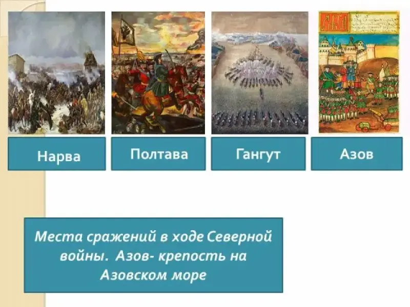 3. Нарва, Полтава, у Гангут, Азов. (Места сражений в ходе Северной войны, Азов- крепость на Азовском море)