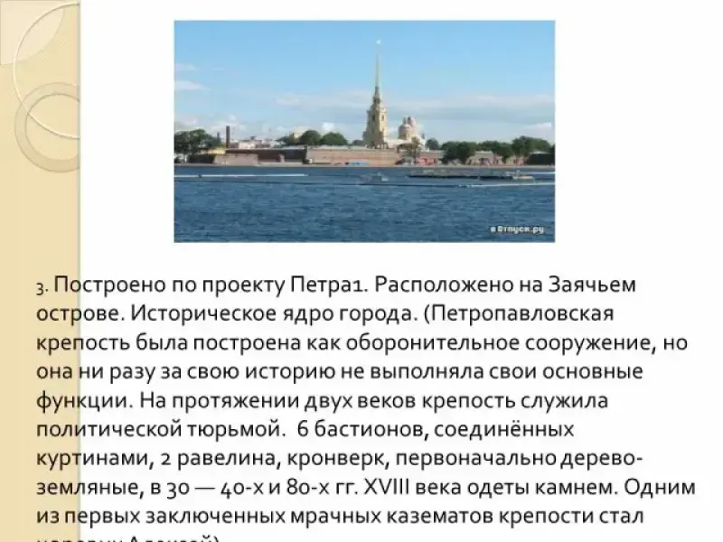 3. Построено по проекту Петра 1. Расположено на Заячьем острове. Историческое ядро города. (Петропавловская крепость была построена как оборонительное сооружение, но она ни разу за свою историю не выполняла свои основные функции. На протяжении двух веков крепость служила политической тюрьмой. 6 бастионов, соединённых куртинами, 2 равелина, кронверк, первоначально дерево-земляные, в 30-40-х и 80-х гг. XVIII века одеты камнем. Одним из первых заключенных мрачных казематов крепости стал царевич Алексей).