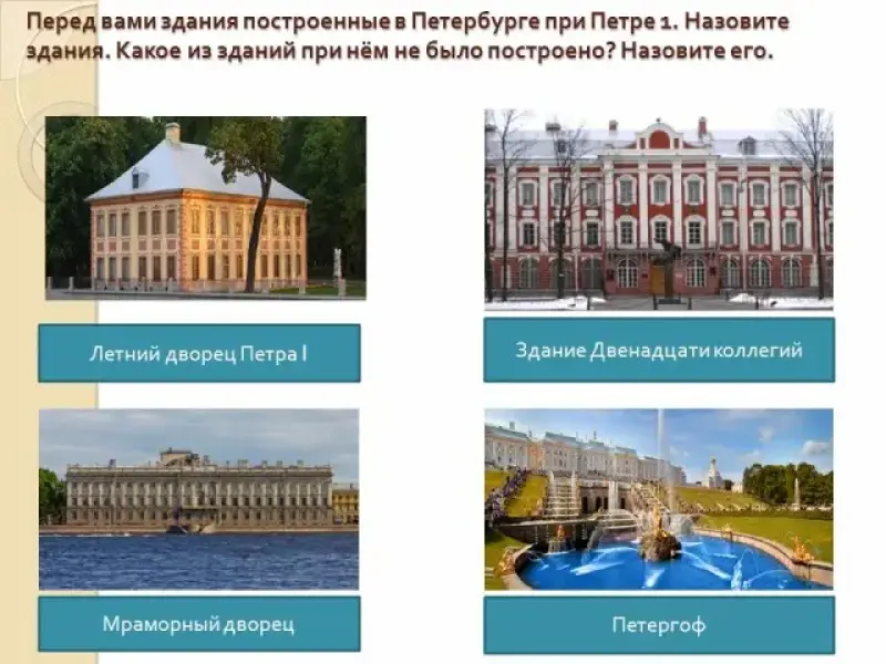 X. Культура. Перед вами, здания построенные при Петре1. Расскажите о них.