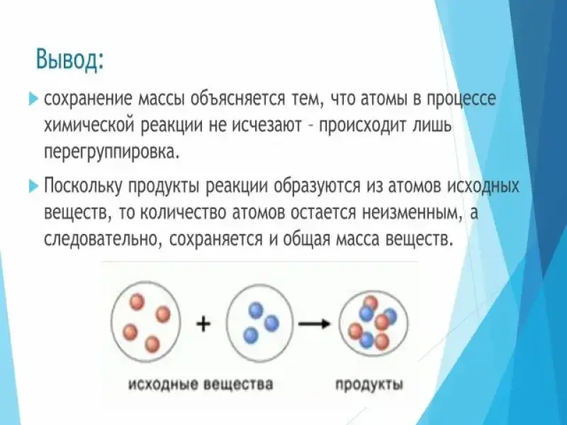Вывод: сохранение массы объясняется тем, что атомы в процессе химической реакции не исчезают - происходит лишь перегруппировка. Поскольку продукты реакции образуются из атомов исходных веществ, то количество атомов остается неизменным, а, следовательно, сохраняется и общая масса веществ. (слайд 11)