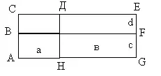 1. Выразите через а,в,с,d площадь прямоугольника АВFG. Сделайте это двумя способами. Вы получите равенство двух выражений для площади прямоугольника. Запишите его.