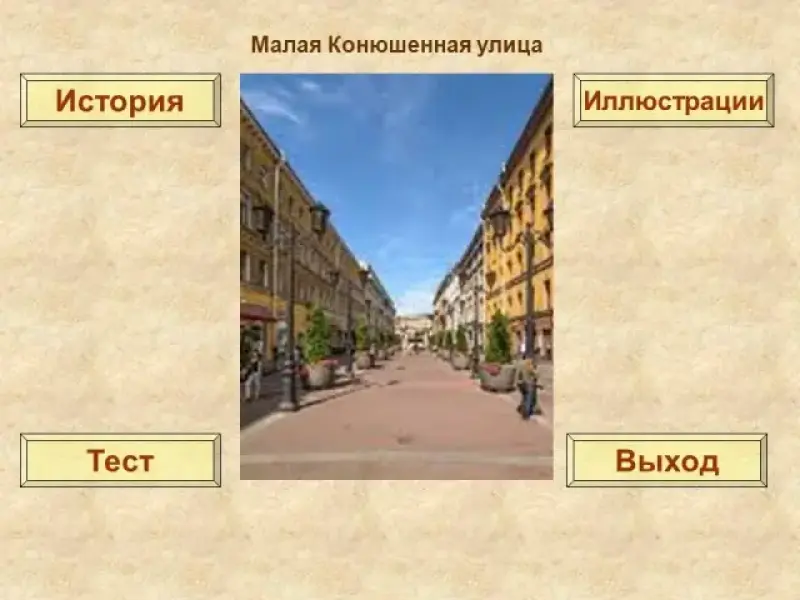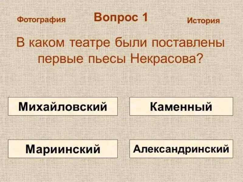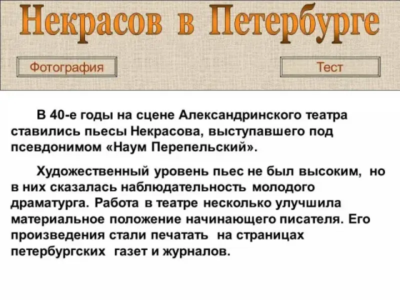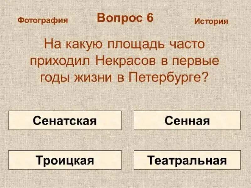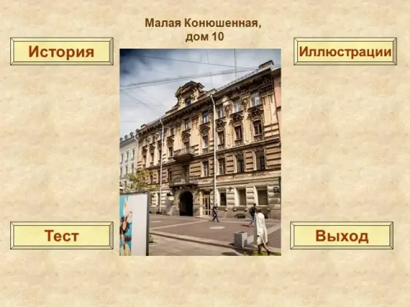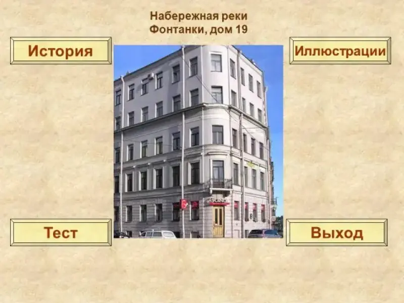 Каждому вопросу посвящено три слайда: слайд с иллюстрацией, где показан исторический памятник или место, связанное с именем Некрасова в Петербурге; слайд с вопросом по теме и вариантами ответов; слайд со справочным материалом или информацией о памятном месте. Все три слайда по теме взаимосвязаны. Со слайда с иллюстрациями можно перейти к исторической справке о памятнике (узнать информацию, которая может помочь ответить на вопрос теста); можно сразу перейти к вопросу теста или к иллюстрации о следующем историческом памятнике. Если учащиеся сомневаются с выбором ответа на слайде тестового вопроса, они могут вернуться к исторической справке или снова посмотреть фотографию по теме. Когда презентация используется как обучающее пособие, со слайда с исторической справкой учащиеся могут вернуться к фотографии объекта или попробовать свои знания в тесте.