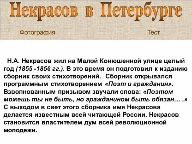 Представленный в презентации справочный материал поможет учащимся с проблемами слуха более полно и развернуто познакомиться с основными этапами жизни и творчества Н.А. Некрасова в Петербурге. Одновременно они могут просматривать иллюстрации по теме.