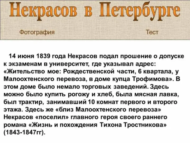 14 июня 1839 года Некрасов подал прошение о допуске к экзаменам в университет, где указывал адрес: "Жительство мое: Рождественской части, 6 квартала, у Малоохтенского перевоза, в доме купца Трофимова". Здесь же "близ Малоохтенского перевоза" Некрасов "поселил" главного героя своего раннего романа "Жизнь и похождения Тихона Тростникова" (1843-1847гг).
