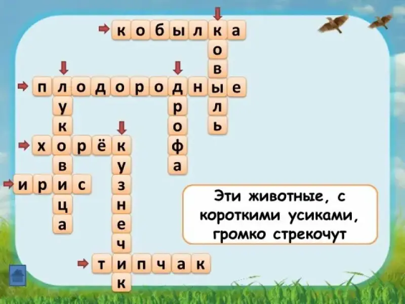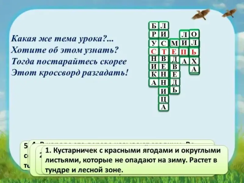 4. В народе это дерево называют сладким. Во время цветения к нему летят пчелы, и мед потом будет самый душистый. 5. Лиственное дерево со стволом черного или серого цвета, его легко узнать по небольшим темным шишечкам на ветках. Ответы: 1. Брусника. 2. Лиственница. 3. Медведь. 4. Липа. 5. Ольха. Ключевое слово: Степь. |