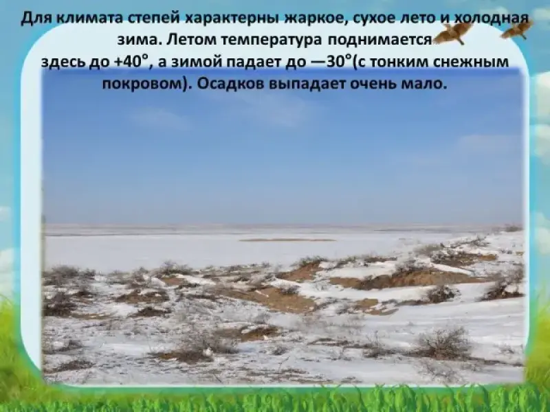 Для климата степей характерны жаркое, сухое лето и холодная зима. Летом температура поднимается
