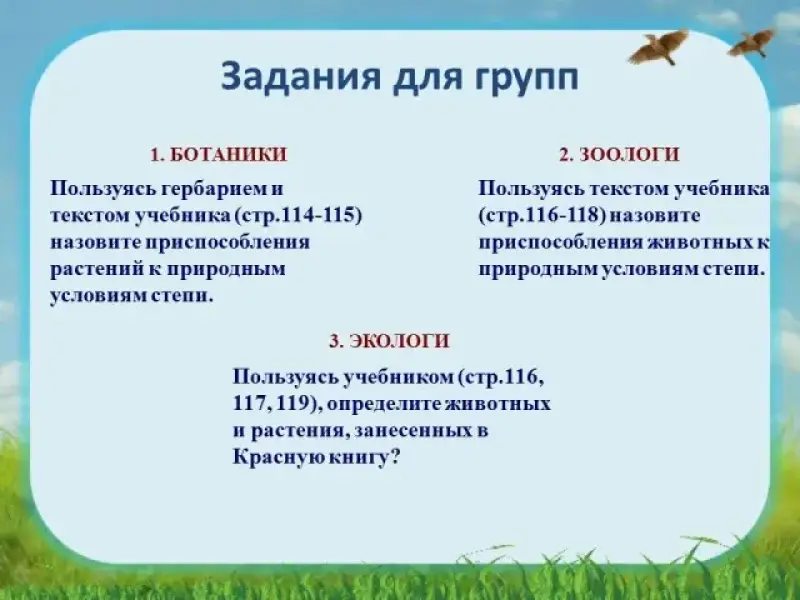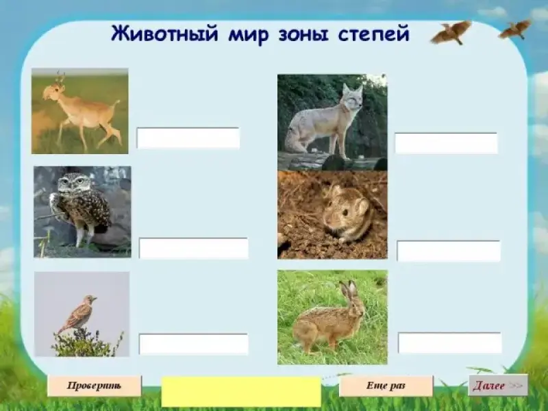 - Уметь: работать с картой, гербарием, приводить примеры представителей разных групп растений и животных степей, раскрывать особенности их внешнего вида и жизни, использовать полученные знания для поиска дополнительной информации о родной стране.