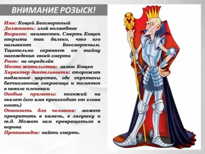 Возраст: неизвестен. Смерть Кощея сокрыта так далеко, что его называют Бессмертным. Тщательно охраняет он тайну нахождения своей смерти