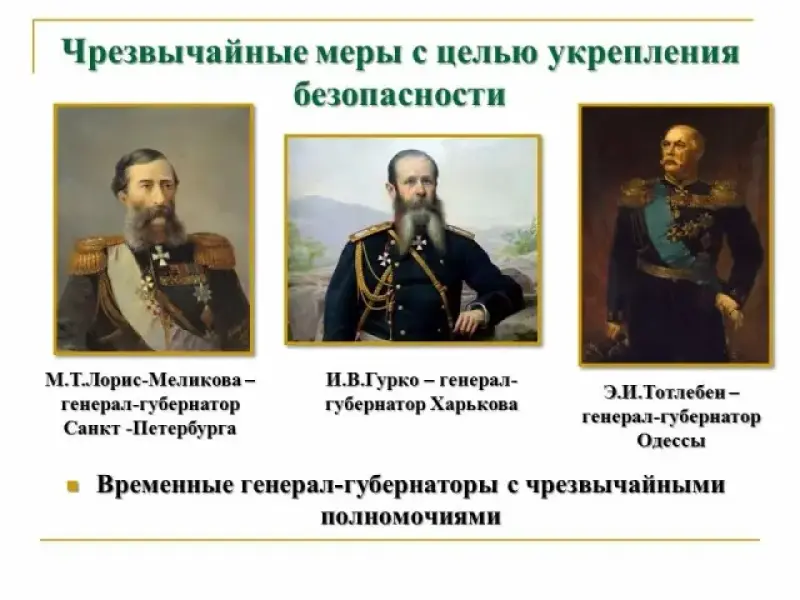 Основные персоналии: Александр II, митрополит Филарет (Дроздов), Дмитрий Алексеевич Милютин, Николай Алексеевич Милютин, Петр Александрович Валуев, Дмитрий Андреевич Толстой, Федор Федорович Трепов, Петр Андреевич Шувалов, Михаил Тариелович Лорис-Меликова