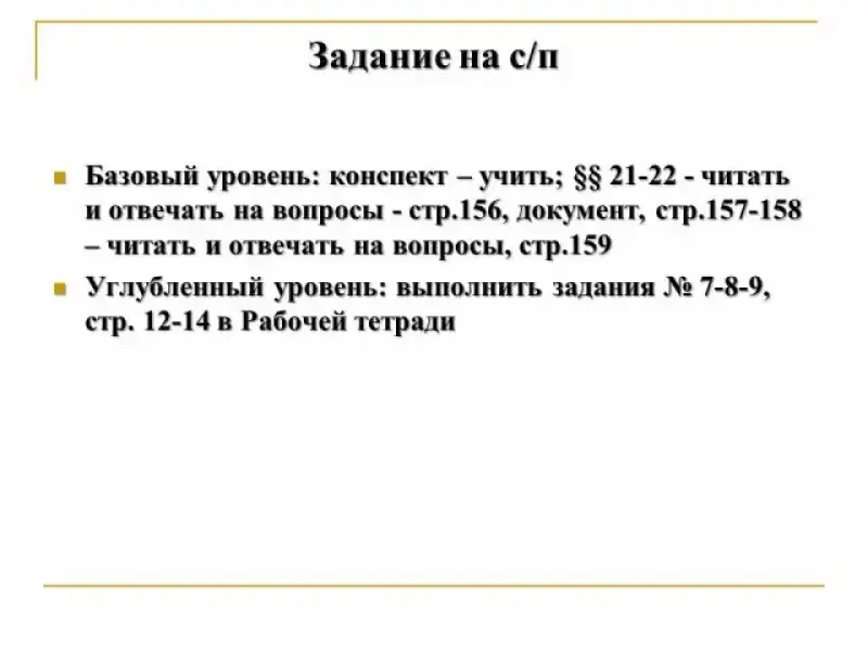 Базовый уровень: конспект - учить; параграфы 21-22 - читать и отвечать на вопросы - стр.156, документ, стр.157-158 - читать и отвечать на вопросы, стр.159