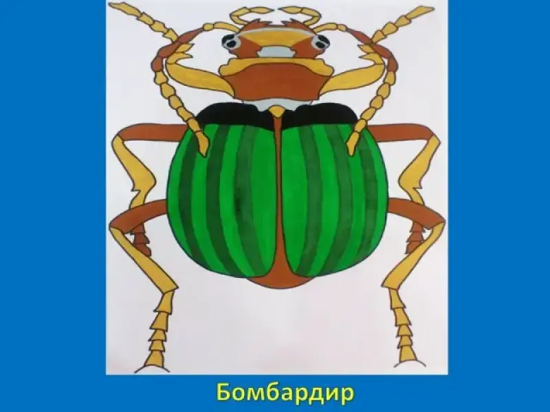 (слайд № 5) Жук "Голиаф" - когда сидит на цветке, напоминает изумруд от бронзового блеска крыльев. Жук этот является самым тяжёлым летающим насекомым, величиной почти с ладонь человека, вес сто граммов, переносит огромные тяжести. Чемпион среди насекомых по весу, довольно силён и его непросто удержать в руках. Этого медлительного травоядного жука часто держат дома. (слайд № 6) Жук "Притворяшка" - насекомое безвредное, похоже на паука, своего ядовитого дальнего родственника с восемью ногами. При опасности жук впадает в оцепенение и притворяется мёртвым. За эту особенность он назван "притворяшкой". (слайд № 7) Жук "Божья коровка" - жук - солнышко, похож на половинку мячика. Его все знают, красный с чёрными точками (как будто пятна на солнце), но вместо точек бывают запятые, тире и даже буква "М", и цвета могут быть жёлтые, чёрные, белые. Яркий цвет - это защита от врагов. (слайд № 8) "Цветочный жук - толстоножка" питается цветочной пыльцой. Подобно медоносной пчеле, он опыляет растения и помогает их размножению, перенося пыльцу с одного цветка на другой. (слайд № 9) Жук "Златка древесная" живёт на неровной коре дерева, где её покрытое пятнами бугристое тельце становится почти невидимым. (слайд № 10) Жук "Трещалка лилейная" - лаково - красный , питается листьями, почками, стеблями, цветами лилий. Это жук - пискун, чувствуя опасность, издаёт звук, исходящий из брюшной области. Хорошо летает и прекрасно прячется - при приближении опасности падает на землю и переворачивается чёрным брюшком вверх. На фоне земли становится незаметным. (слайд № 11) Жук "Бомбардир" - в случае опасности выпускает опасную ядовитую жидкость из кончика брюшка. Температура в момент выстрела 100 градусов, а её выброс сопровождается громким звуком. Тому, кто решится напасть на жука, грозят ещё и ожоги. (слайд № 12) Жук "Дровосек - титан" - самый большой жук в мире. Его челюсти такие мощные, что он может перекусить пополам карандаш. (слайд № 13) Жук "Хищник" охотится на насекомых, пауков и улиток. Во время охоты он выбрасывает изо рта длинный отросток с колючей пластинкой на конце. Эта липкая пластинка прикрепляется к телу жертвы. Тело жука содержит токсин, действующий сильнее, чем яд кобры, и защищает жука от более крупных хищников. (слайд № 14) Жук "Плавунец" использует ноги, как вёсла в воде, но может летать, от хищников защищается, выпуская ядовитую мутноватую жидкость с неприятным запахом. Ловкий охотник, питается насекомыми, головастиками, моллюсками, маленькими лягушатами, мелкими рыбками. (слайд № 15) Жук "Арлекин" выглядит так, что кажется, будет выделяться в любой толпе, окраска тела напоминает костюм средневековых шутов. Но он живёт на стволах ярких, покрытых лишайником деревьев, где необычная расцветка помогает ему быть незаметным. Жук размером с карандаш. Один из самых крупных. Пьёт сок некоторых деревьев. (слайд № 16) Жук "Лягушка" - самцы имеют длинные и сильные задние ноги (отсюда и название за схожесть с лягушками). Они не прыгают. Их сильные задние ноги используются для обхвата стеблей в то время, когда жуки их грызут. (слайд № 17) Жук "Быстрянка" выглядит и пахнет точь - в точь как муравей. Благодаря этому жукам удаётся обмануть свирепую армию муравьёв, среди которых они живут. Муравьи уверены, что жуки - такие же, как они, поэтому заботятся о них, кормят и защищают. (слайд № 18) Жук "Олень" - получил с