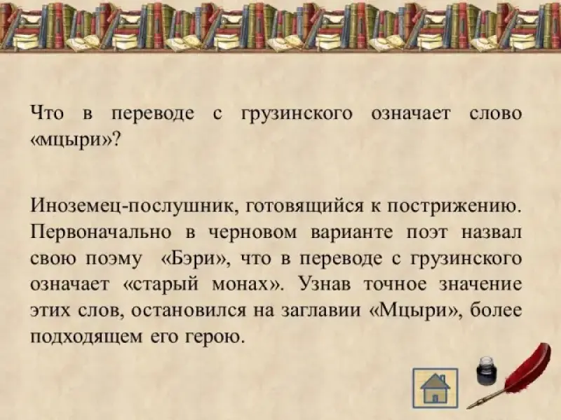 Что в переводе с грузинского означает слово "мцыри"? (Иноземец-послушник, готовящийся к пострижению. Первоначально в черновом варианте поэт назвал свою поэму "Бэри", что в переводе с грузинского означает "старый монах". Узнав точное значение этих слов, остановился на заглавии "Мцыри", более подходящем его герою.)