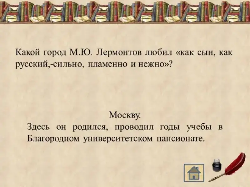 Какой город М.Ю. Лермонтов любил "как сын, как русский,-сильно, пламенно и нежно"? (Москву. Здесь он родился, проводил годы учебы в Благородном университетском пансионате.)