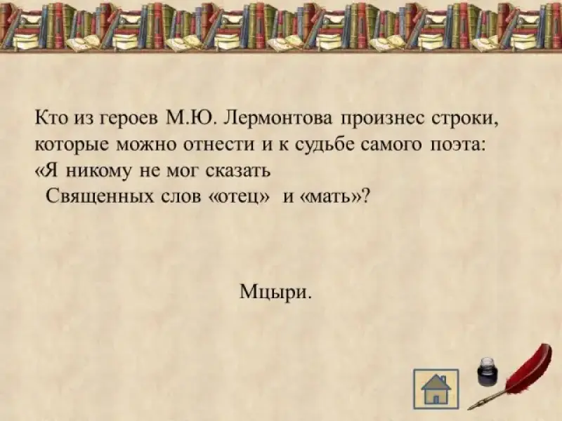 Здесь находится предмет - олицетворение образа гонимого судьбой Лермонтова-странника, "до срока созревшего" и "выросшего в отчизне суровой". (Дубовый листок, 10 баллов)