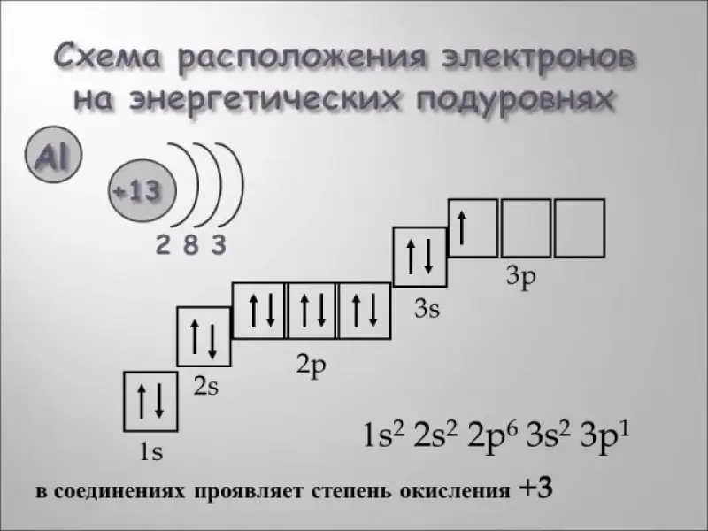 Охарактеризовать строение атома алюминия (ученик на доске строит схему строения атома, электронную формулу, распределение электронов по ячейкам). Ученики делают вывод о том, что основной степенью окисления алюминия является степень окисления +3.