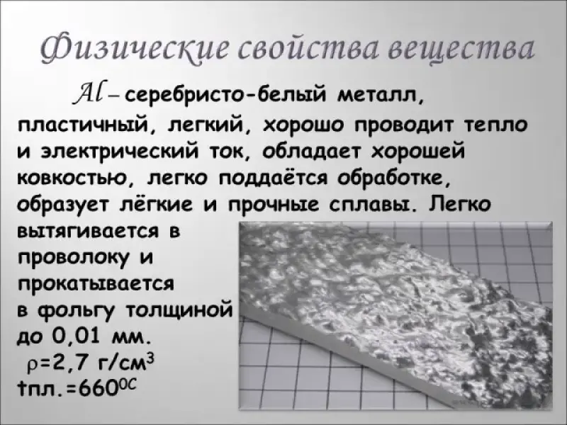 Учащиеся рассматривают образцы алюминия на столе и характеризуют физические свойства алюминия (Слайд № 8). Записать физические свойства в тетрадь.