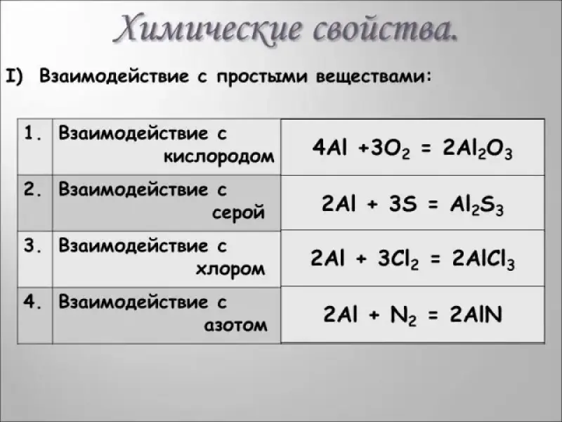 Итак, алюминий металл, значит для него характерны такие химические свойства, как взаимодействие с неметаллами. Учащимся предлагается написать реакции взаимодействия алюминия с кислородом, хлором, серой и азотом. (К доске выходят четыре человека записывают реакции и составляют схемы электронного баланса).