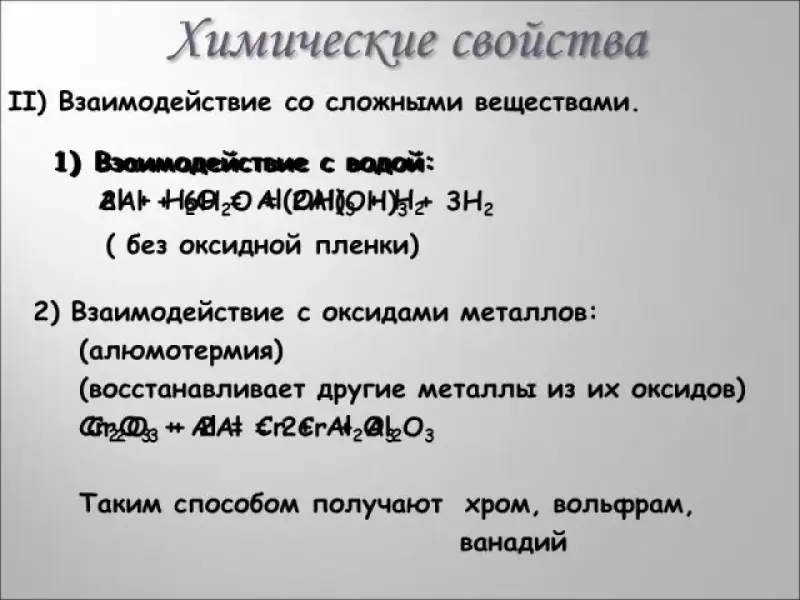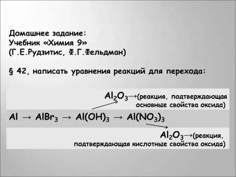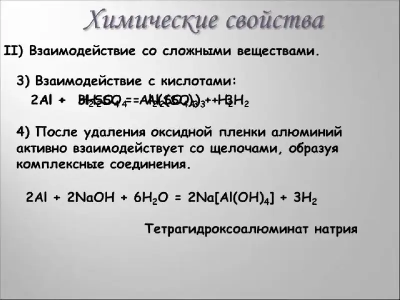 Далее рассматривается взаимодействие алюминия с оксидами металлов (алюмотермия), растворами кислот и растворами щелочей. Ученики разбирают соответствующие реакции на доске. Проверка происходит с использованием презентации (Слайд № 11)