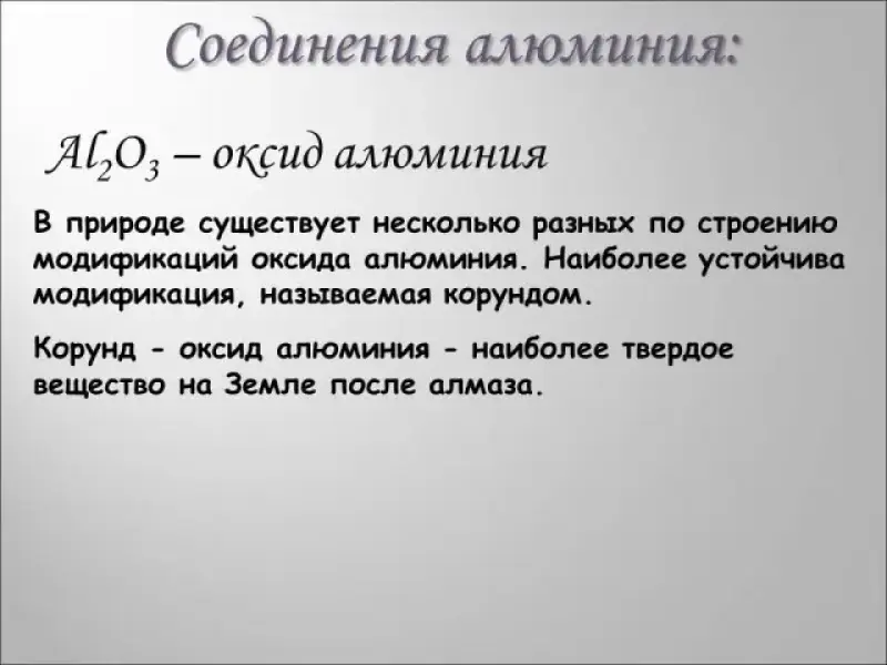 Группа учащихся, которая собирала материал о корунде, рассказывает, о том, что встречающийся в природе оксид алюминия может образовывать много аллотропных модификаций, одной из которых является корунд. Рассказ сопровождается демонстрацией слайдов (Слайд № 13-22 )