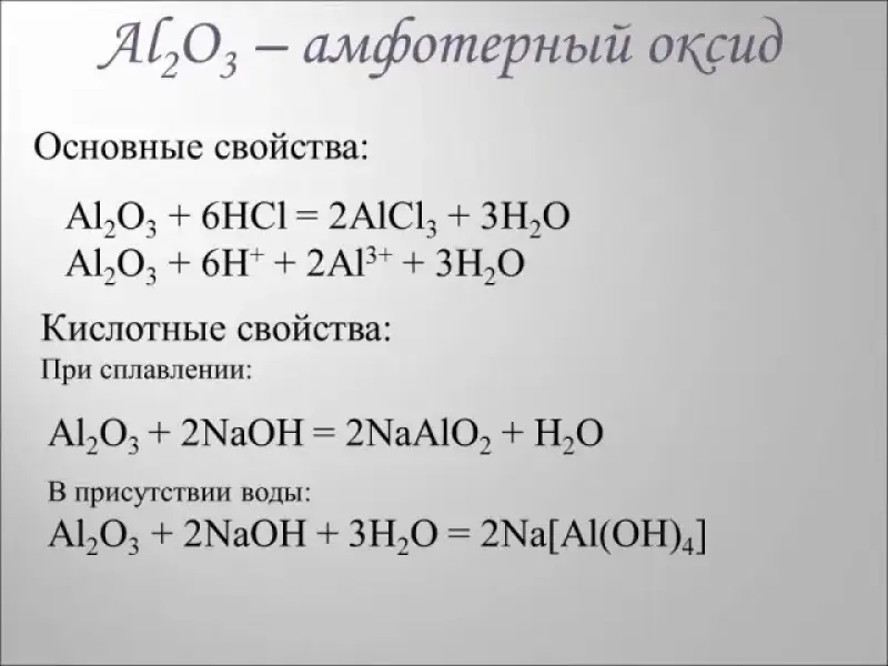 Учитель предлагает ребятам рассмотреть химические свойства оксида алюминия. Ребята вспоминают, что такое амфотерность, какие реакции характеризуют амфотерные свойства. Соответствующие реакции записываются на доске и в тетрадях учащихся.