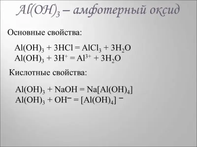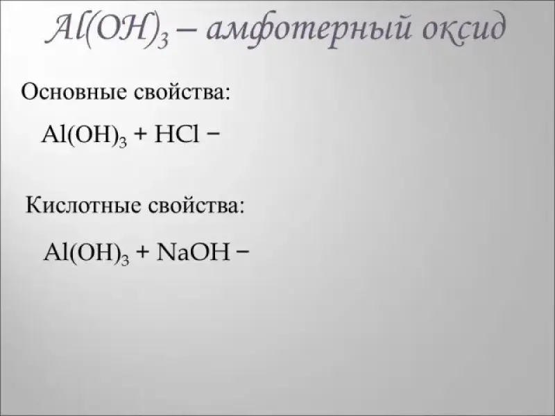 Гидроксид алюминия также является амфотерным соединением. Ребятам предлагается, используя предложенные реактивы, получить гидроксид алюминия и подтвердить его амфотерные свойства. После обсуждения, ребята выполняют соответствующие опыты и записывают уравнения реакций в тетрадь (если времени до конца урока остается немного, то записать уравнения ребятам может быть предложено в качестве домашнего задания)