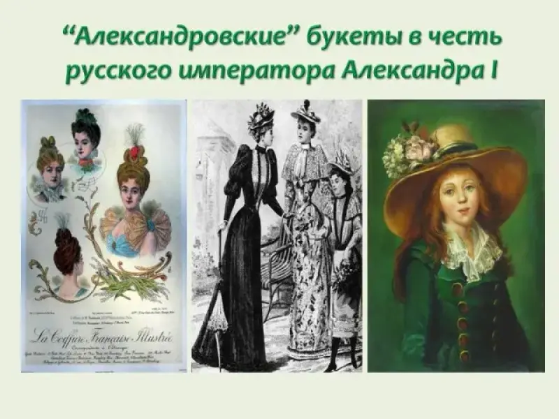 Слайд 5. Во времена А. Пушкина в России пользовались популярностью "александровские" букеты в честь русского императора Александра I. Дамы носили букеты, которые были созданы из цветов, первые буквы их составляли имя АЛЕКСАНДР на французский манер. Без этих букетов ни одна порядочная дама не могла показаться в обществе. Маленькие букетики носили в волосах, побольше - на груди.