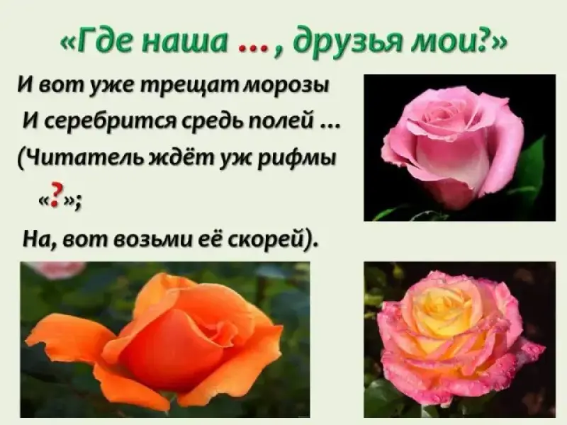 Слайд 8. О какой героине пойдёт речь, если она роскошная, гордая, царственная, стыдливая, холодная? В "Словаре эпитетов русского литературного языка" к слову "роза" приведено 37 эпитетов! А. Пушкин тоже обращался к этому цветку в стихах ("Роза", "Лишь розы увядают ...", "Соловей и роза", "Есть роза дивная: она ..."). Но поэт быстро отошёл от этого образа. "Розы и слёзы" - непременные атрибуты поэзии тех, кто, по выражению Пушкина, пишет "темно и вяло". В "Евгении Онегине" он замечает: