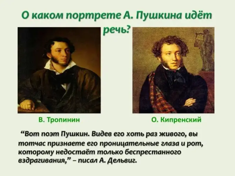 Слайд 9. Перед вами два известных портрета А. Пушкина работы В. Тропинина и О. Кипренского. "Вот поэт Пушкин. Видев его хоть раз живого, вы тотчас признаете его проницательные глаза и рот, которому недостаёт только беспрестанного вздрагивания". Художник О. Кипренский на портрете, заказанном А. Дельвигом летом 1827 года, сумел глубоко отобразить не только внешний вид поэта, но и его внутренний мир.
