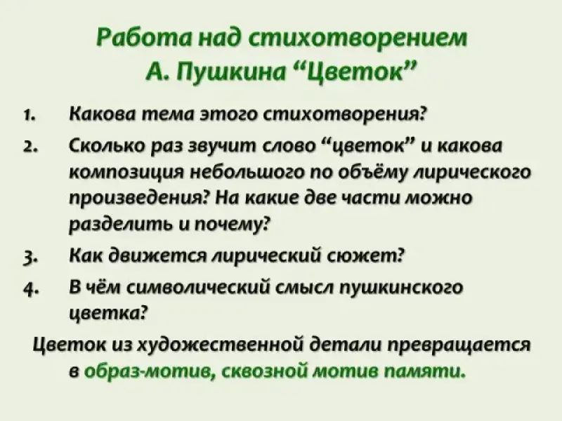 Цветок олицетворяет собой неразрывную связь между миром природы и человеком, художественная деталь превращается в образ-мотив, мотив памяти, сквозной мотив русской литературы.