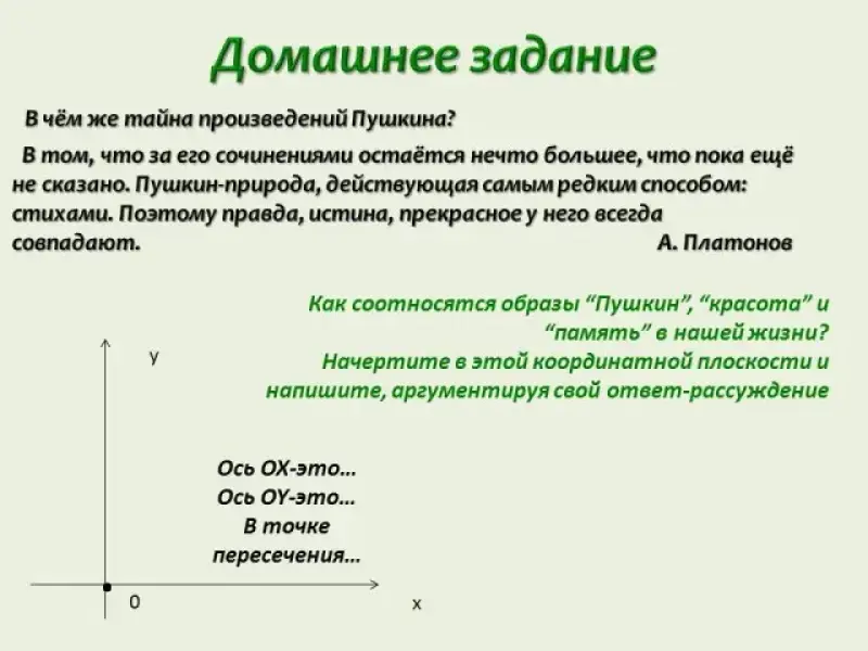 Слайд 21. В необычном по форме домашнем задании "Как соотносятся образы "Пушкин", "красота" и "память" в нашей жизни? тоже важны детали.