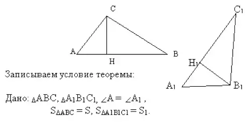 Теорема: Если угол одного треугольника равен углу другого треугольника, то отношение площадей этих треугольников равно отношению произведений сторон, заключающих равные углы.