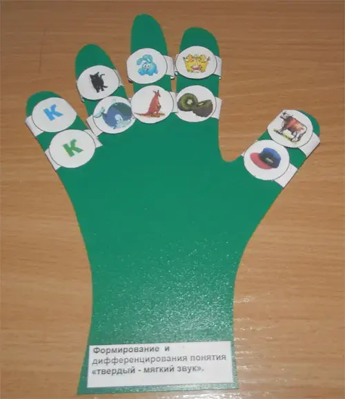 - при формировании и дифференцировании понятия "твердый - мягкий звук": на пальцы левой руки надеваем колечки, в которых звук мягкий, на пальцы правой руки - твёрдый звук (Рисунок3).