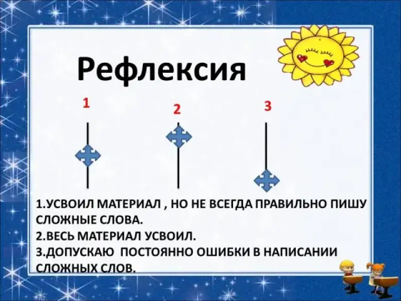 Ученики называют полные названия: безударные проверяемые и непроверяемые гласные, соединительные гласные; парные, удвоенные, непроизносимые согласные; Ь-показатель мягкости, разделительный Ь и Ъ знак, пробел между словами.