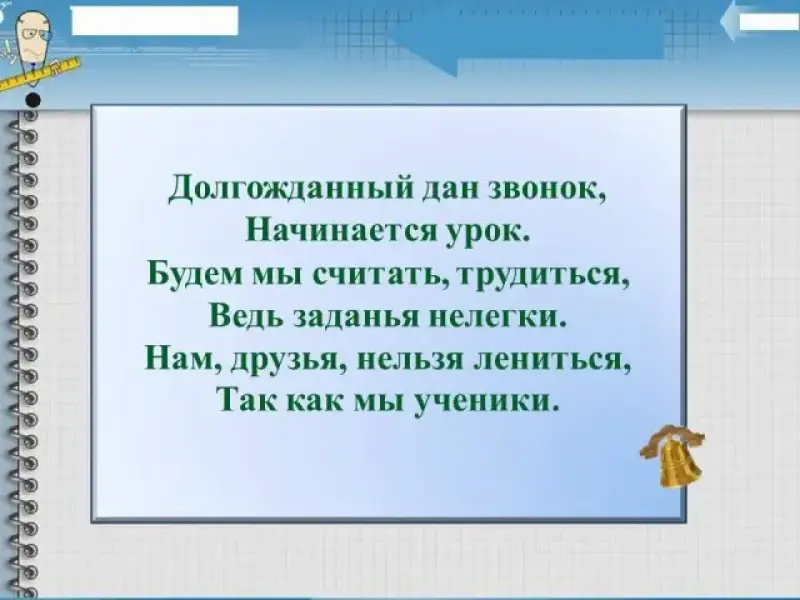 Начинается урок. Будем мы считать, трудиться, Ведь заданья нелегки. Нам, друзья, нельзя лениться, Так как мы ученики. |
